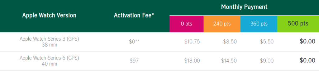 如下图,最新的AppleWatch Series 6, 只需要$97加币的首付,如果每月可以达到500分,那么月供免费!